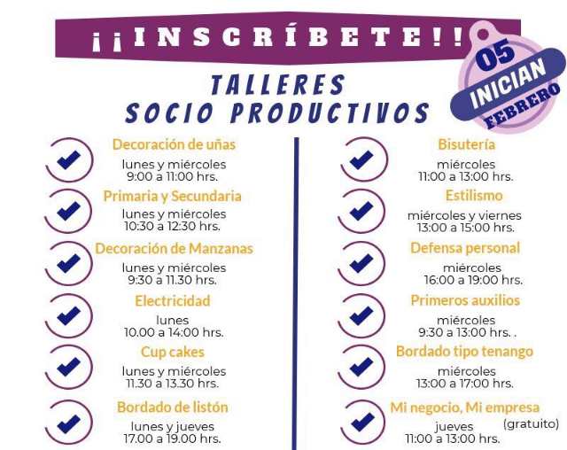 Los cursos a elegir son: corte y confección, elaboración de productos de limpieza, cup cakes, estilismo, gelatina artística, dulces mexicanos, electricidad, tejido, bisutería, tecnología de alimentos, primeros auxilios, automaquillaje, decoración de uñas, decoración de manzanas, electricidad, bordado de listón, tejido y defensa personal, además de inglés (básico o avanzado). Todos estos cursos tienen un costo de 200 pesos.