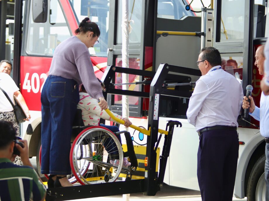 Los vehículos están equipados con elevadores, espacios para sillas de ruedas, así como sistemas de audio y video para facilitar la comunicación a personas con discapacidad visual y auditiva.