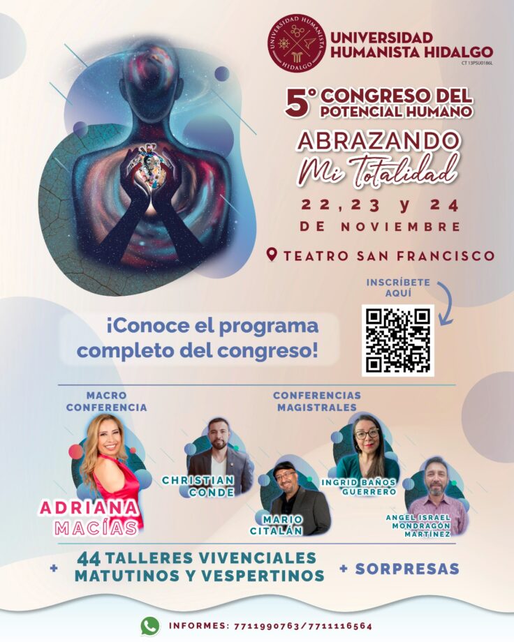Del 22 al 24 de noviembre, la Universidad Humanista Hidalgo (UHH) realizará el Quinto Congreso del Potencial Humano “Abrazando mi totalidad”, el cual constará de conferencias y 44 talleres vivenciales en diversos temas.
