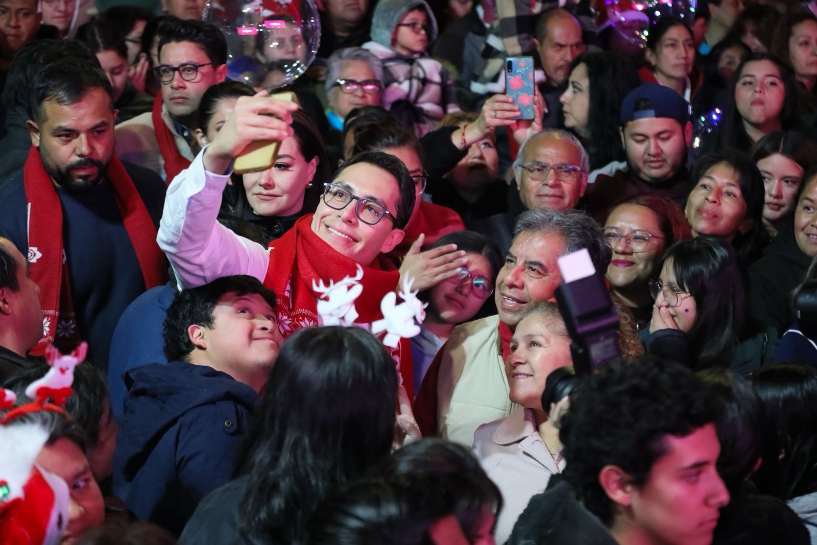 Cientos de pachuqueños se congregaron en la plaza Independencia, al pie del Reloj Monumental, para ser testigos del encendido del árbol de Navidad y la villa navideña organizada por el Ayuntamiento de Pachuca.