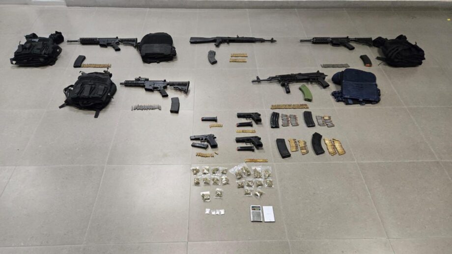 Durante el operativo se aseguraron 200 dosis de marihuana, 13 dosis de droga sintética “cristal”, armas de fuego, chalecos balísticos y cartuchos útiles.