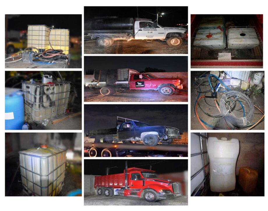 En el primer punto, ubicado en la localidad de Conejos, se hallaron diversos contenedores, una manguera de alta presión, herramientas para la extracción ilegal de hidrocarburo, un arma de fuego larga tipo escopeta, inhibidor de señal, así como cuatro vehículos, uno de ellos con reporte de robo vigente.