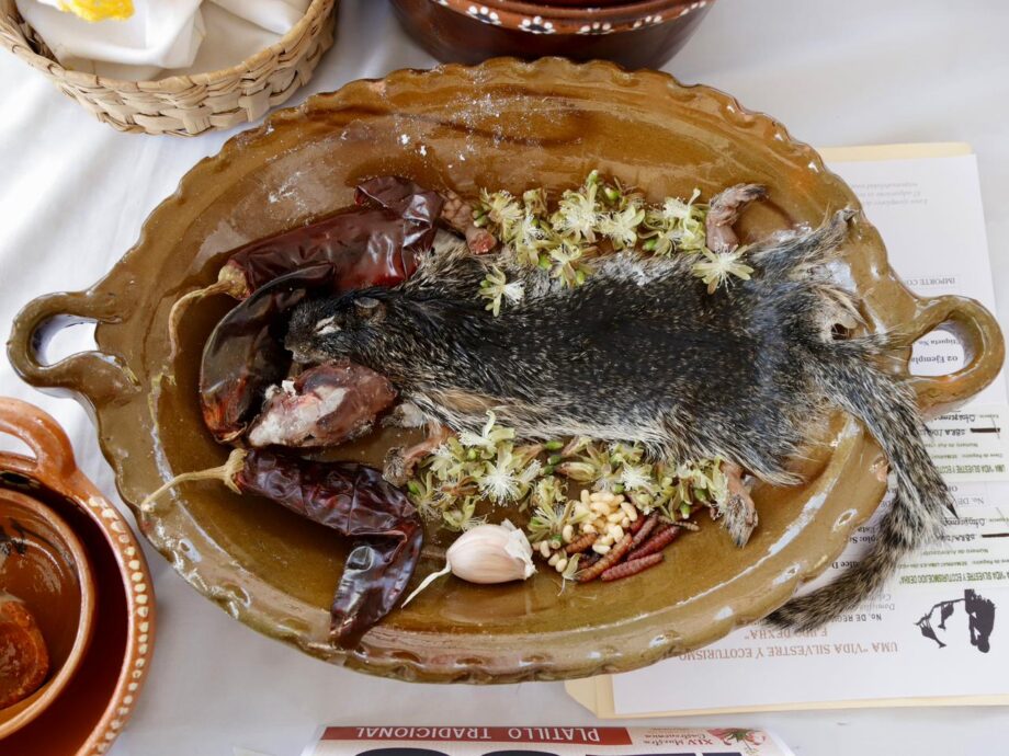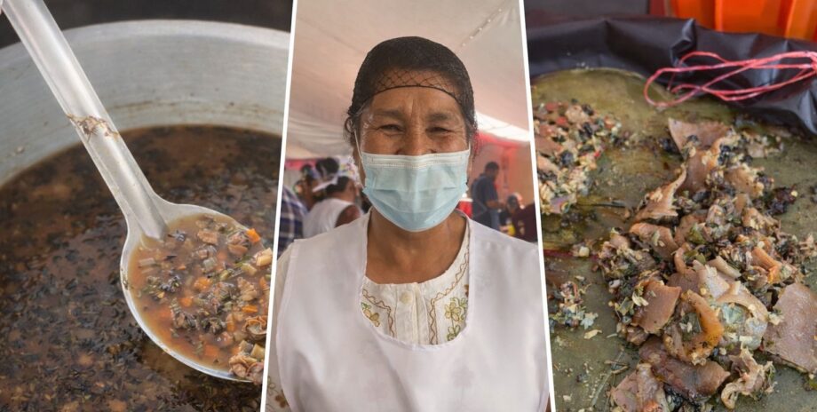 Juanita Hernández Cano lleva casi 30 años participando en esta tradicional muestra, donde también ofrece platillos como conejo y tlacuache en adobo, cocinados en penca de maguey, lo que les aporta un sabor distintivo.