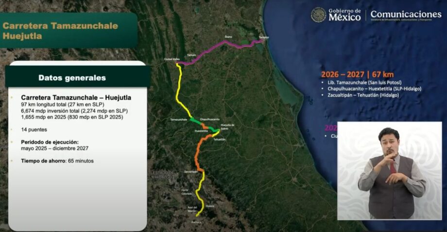 El tramo, de 97 kilómetros de longitud, conectará los municipios de Huejutla (Hidalgo) y Tamazunchale (San Luis Potosí), y tendrá una inversión total de 6 mil 674 millones de pesos, de los cuales mil 655 millones serán ejercidos durante 2025.