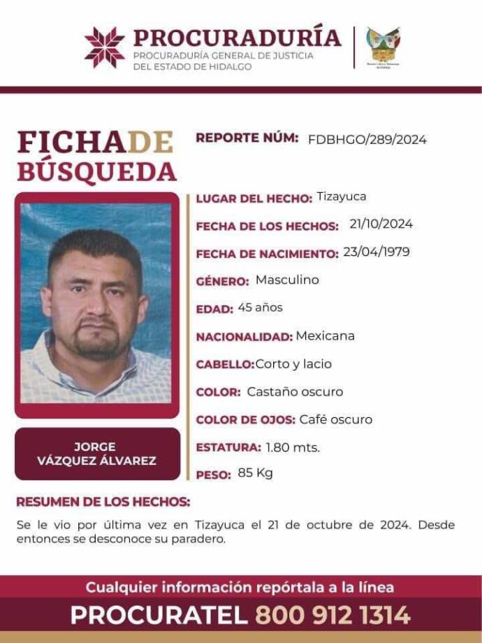 La Procuraduría General de Justicia del estado de Hidalgo lanzó en días pasados una ficha de búsqueda en un esfuerzo por localizar a Jorge, cuyo paradero sigue siendo un misterio desde hace dos semanas.