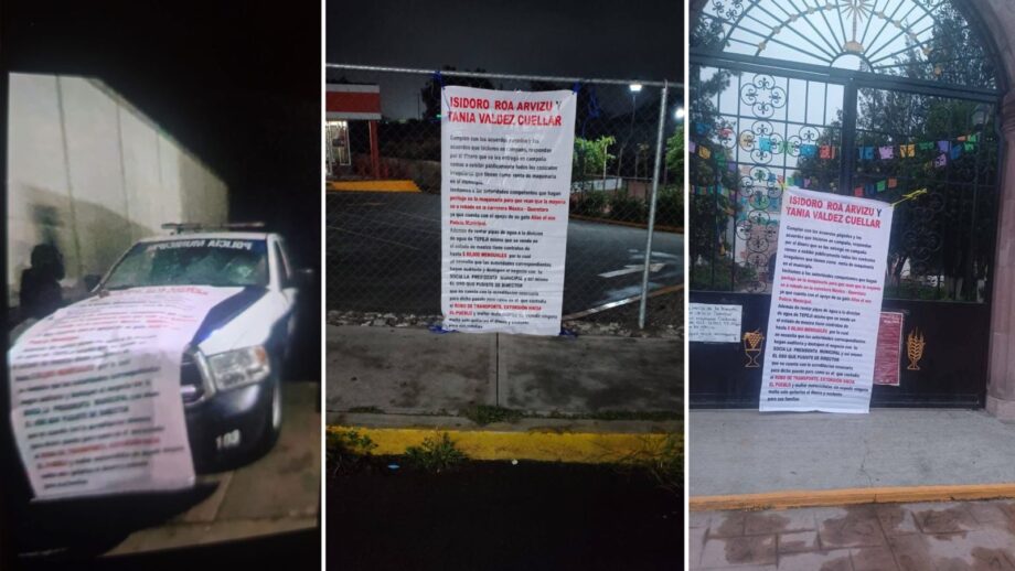 Las lonas, colocadas en distintos puntos del municipio, acusan a la presidenta municipal y al jefe policial de presuntos actos de corrupción, extorsiones y contratos irregulares, e incluso los señalan por un supuesto desvío de recursos y complicidades con grupos delictivos.