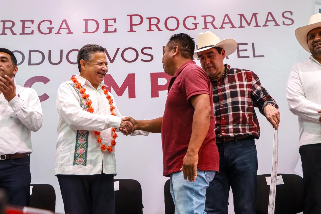 Por su parte, Napoleón González Pérez, secretario de Agricultura y Desarrollo Rural, detalló que los apoyos entregados incluyen semillas certificadas de maíz, bombas, desbrozadoras, rollos de alambre, molinos picadoras, ordeñadoras, equipamiento acuícola, aves de doble propósito, vientres porcinos, conejos y 318 mil crías de peces, entre otros insumos.