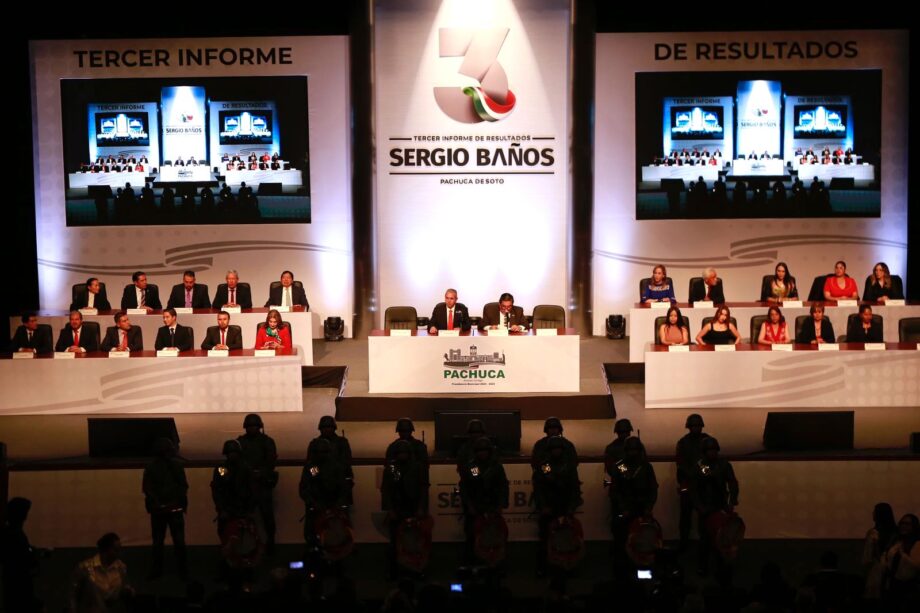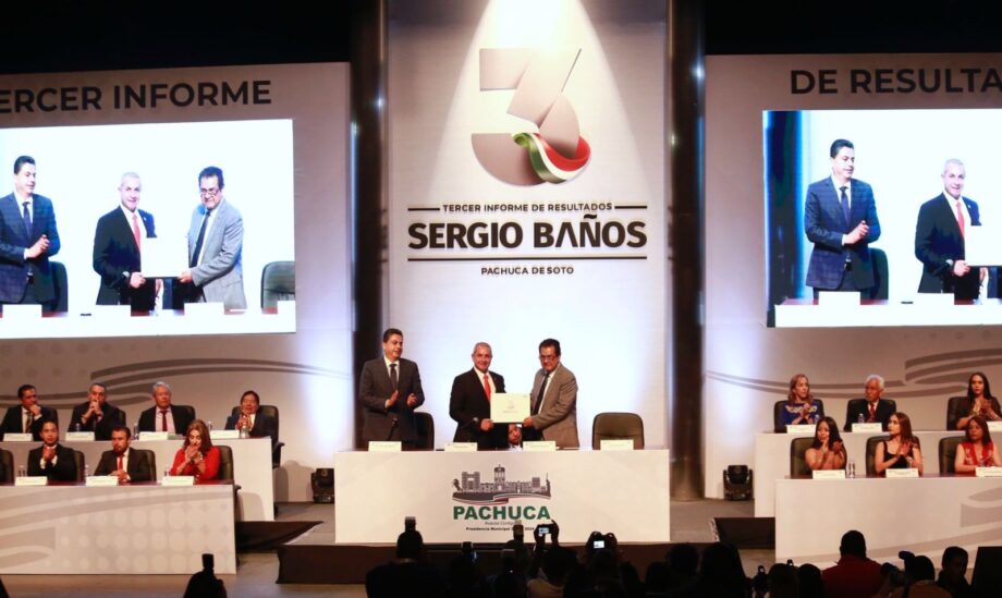En sesión solemne de Cabildo celebrada de manera extraordinaria en el auditorio Gota de Plata, el presidente municipal de Pachuca, Sergio Baños Rubio, rindió su tercer informe de resultados, en el que destacó que “se ha hecho más con menos”.