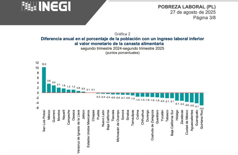 La pobreza laboral en Hidalgo disminuyó un 3.1% entre el segundo trimestre de 2024 y el mismo periodo de 2025, según las cifras dadas a conocer este miércoles por el Instituto Nacional de Estadística y Geografía (INEGI).