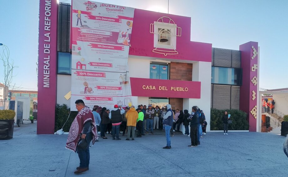 Integrantes de la Unión Nacional de Trabajadores Agrícolas (UNTA) se manifiestan frente a la presidencia municipal, exigiendo soluciones a dos demandas: la intervención en un conflicto de tierras en la comunidad de El Velillo y la atención a problemáticas relacionadas con comerciantes, incluidos tianguistas establecidos en la demarcación.