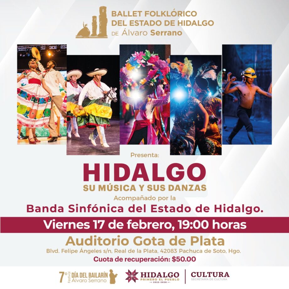 La Secretaría de Cultura y el Ballet Folklórico del Estado de Hidalgo de Álvaro Serrano presentaron el programa “Hidalgo: su música y sus danzas”, con el cual celebrarán el séptimo Festival del Día Internacional del Bailarín, el próximo 17 de febrero, en el Auditorio Gota de Plata, a las 19:00 horas.