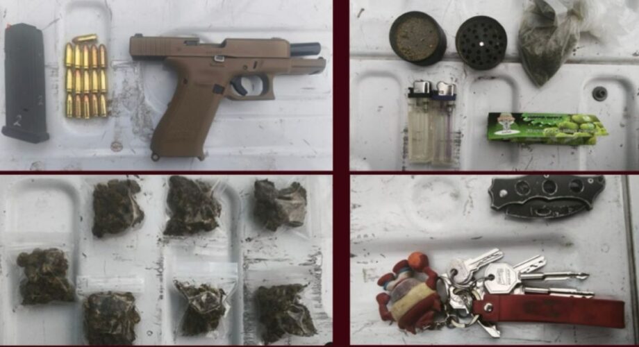 En la inspección de la unidad y de los ocupantes fueron localizadas un arma de fuego corta calibre 9 milímetros, diversas dosis de droga y una navaja, elementos que presuntamente eran utilizados para la comisión de actividades ilícitas.