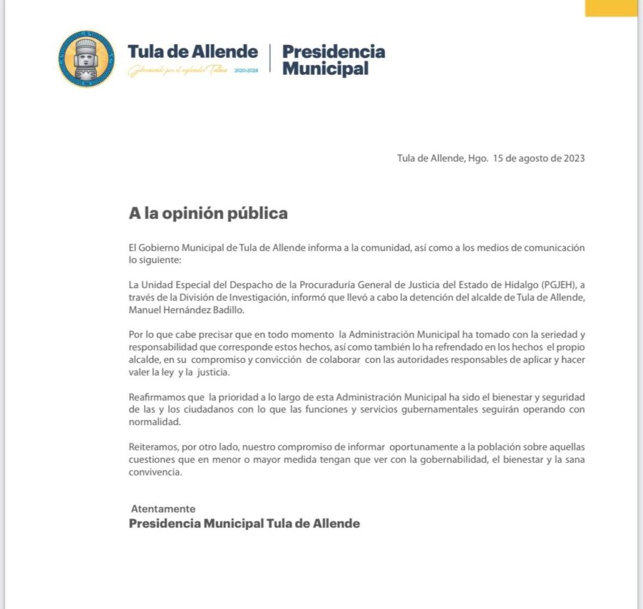 Al respecto, esta mañana el Ayuntamiento de Tula emitió un comunicado y señaló que ha tomado con la seriedad y responsabilidad que corresponde estos hechos, así como también lo ha refrendado el propio alcalde, en su compromiso y convicción de colaborar con las autoridades responsables de aplicar y hacer valer la ley y la justicia.