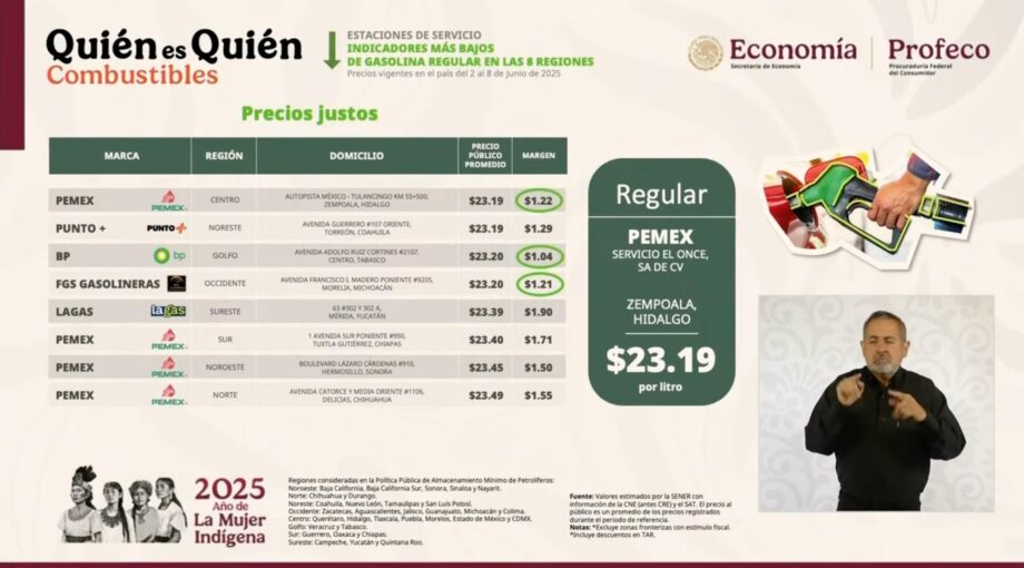 Uno de los datos más relevantes fue el reconocimiento a una estación de servicio Pemex en Zempoala, Hidalgo, de la empresa Servicio El Once SA de CV, la cual destacó por ofrecer uno de los precios más bajos de toda la región centro, vendiendo el litro en 23.19 pesos. Además, se destacó que el margen de ganancia en esta estación no supera los dos pesos, lo cual cumple con los criterios de “precio justo” establecidos por Profeco.