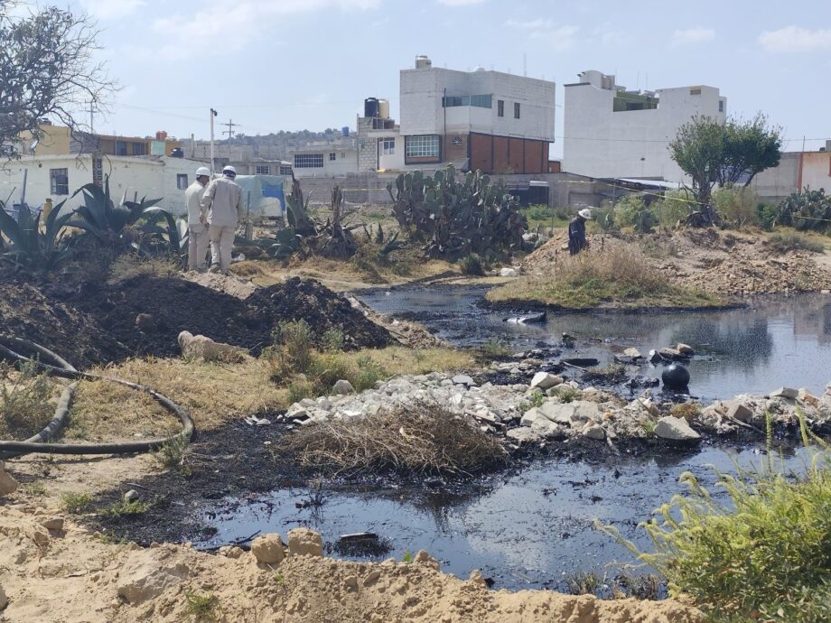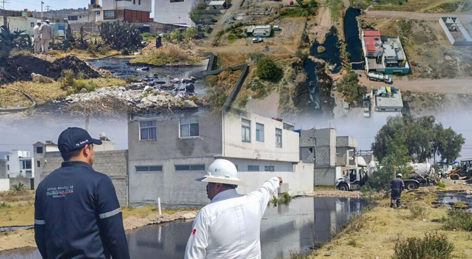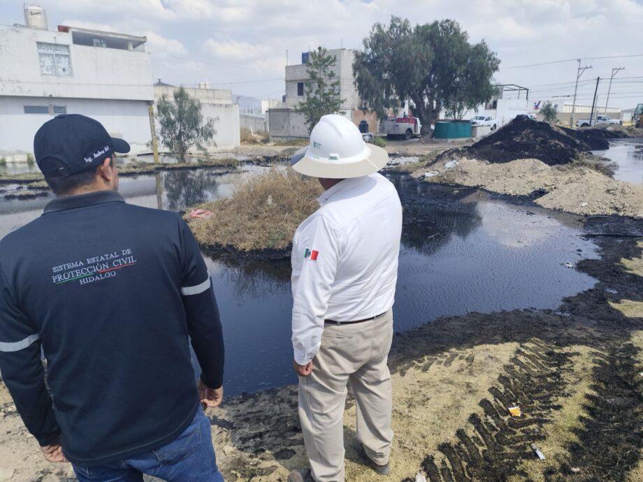 De forma coordinada, la Subsecretaría de Protección Civil y Gestión de Riesgos del Gobierno de Hidalgo realizó un recorrido de verificación en campo junto con personal de PEMEX, confirmando que no existe infiltración del material a la red de drenaje.