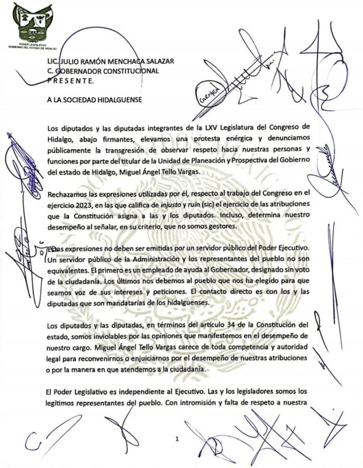 Un total de 21 diputados y diputadas de la 65 Legislatura del Congreso de Hidalgo firmaron una solicitud enviada al gobernador Julio Menchaca para que el secretario Miguel Tello emita una disculpa pública por considerar que existió intromisión de poderes.