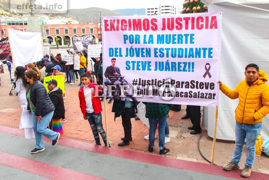 Cerca de 60 personas protestan en la plaza Juárez de Pachuca para exigir justicia por la muerte de Steve, un joven estudiante del Instituto Tecnológico Superior del Occidente del Estado de Hidalgo (ITSOEH), ubicado en Mixquiahuala, que murió a causa de un accidente vial.