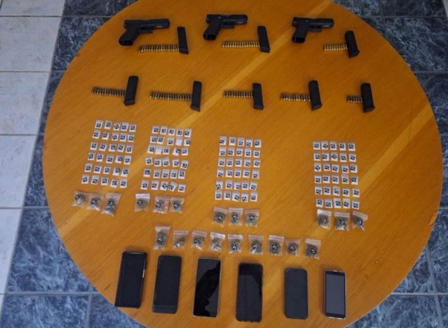 En la intervención fueron aseguradas tres armas cortas, ocho cargadores abastecidos, 104 cartuchos, seis celulares y un vehículo.