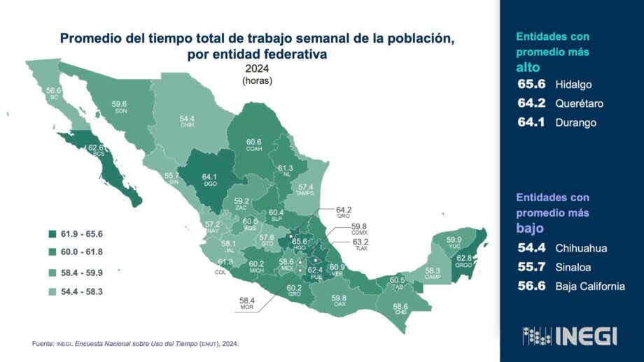 De acuerdo con la Encuesta Nacional sobre Uso del Tiempo (ENUT) 2025, Hidalgo ocupa el primer lugar a nivel nacional en horas dedicadas al trabajo, con un promedio de 65.6 semanales.