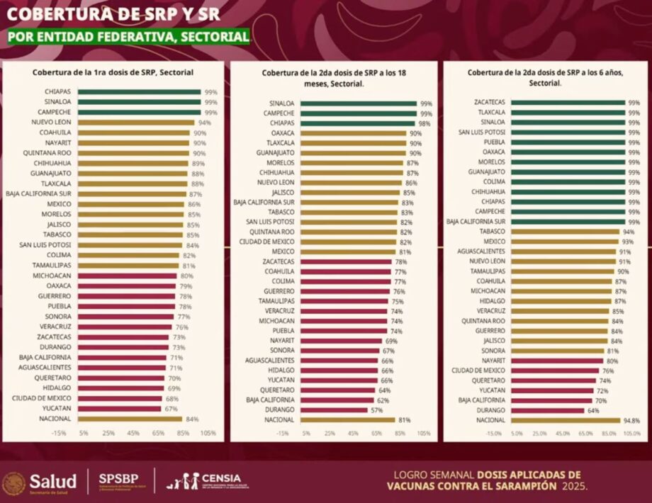 Al presentar su informe, señaló que se cuenta con vacuna suficiente para atender a los sectores de niñas y niños de 1 año a 18 meses de edad, población rezagada de 2 a 9 años, personal de salud y educativo, jornaleros agrícolas, así como para la aplicación de la denominada “dosis cero” a menores de 6 a 11 meses.