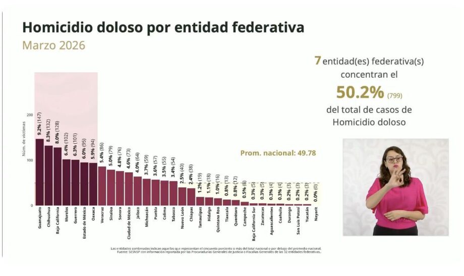 En el desglose por entidad federativa correspondiente a marzo de 2026, siete estados concentraron el 50.2% del total nacional, reflejando una alta incidencia focalizada. Entre ellos destacan Guanajuato (9.2%), Chihuahua (8.3%), Baja California (8%), Morelos (6.4%), Guerrero (6.3%), Estado de México (6%) y Oaxaca (5.9%).