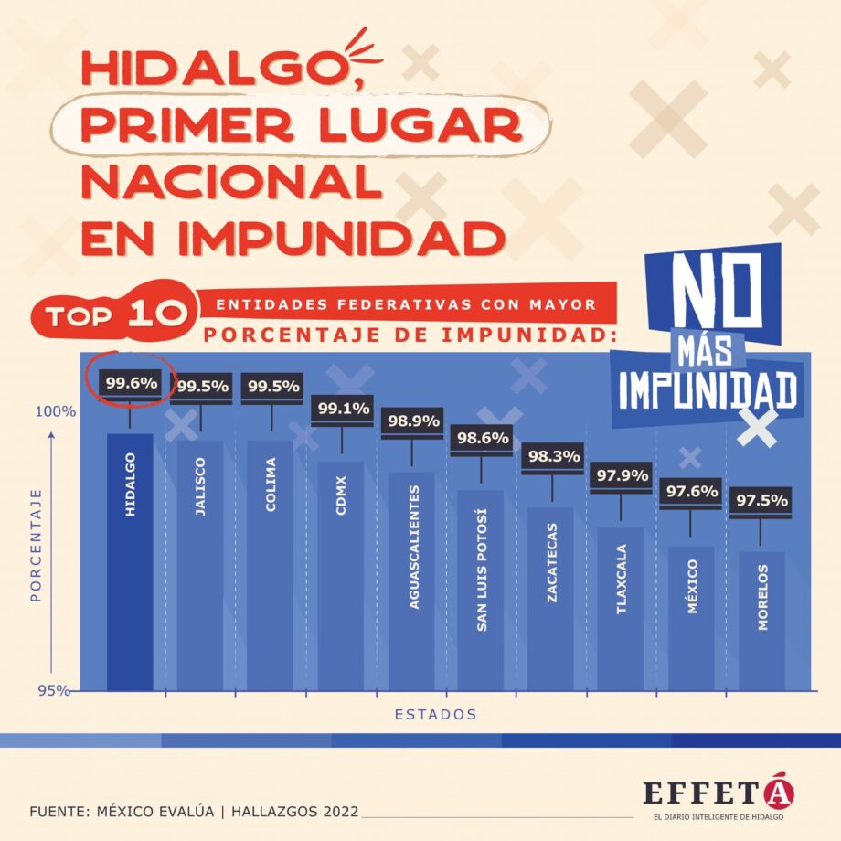 La semana pasada, la organización México Evalúa reveló que en 2022 el índice de impunidad en Hidalgo fue de 99.6 por ciento, lo que colocó al estado como el primer lugar a nivel nacional en este rubro.