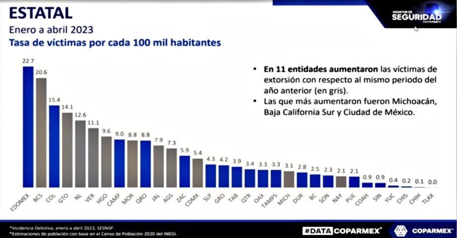 Batres Campos indicó que esta herramienta desarrollada por Coparmex refleja que, en el país, cada hora, al menos una persona es afectada por extorsión y según datos del Secretariado Ejecutivo del Sistema Nacional de Seguridad Pública (SESNSP), en los primeros cuatro meses del año se registraron tres mil 473 víctimas por este delito, una cifra que es 2.4 por ciento menor a la documentada durante el mismo periodo del año anterior en el país.