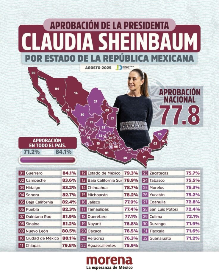 Por otro lado, la encuesta revela que Guanajuato, gobernado por la panista Libia Denisse García Muñoz Ledo, registra los niveles más bajos de aprobación con 71.2 por ciento.
