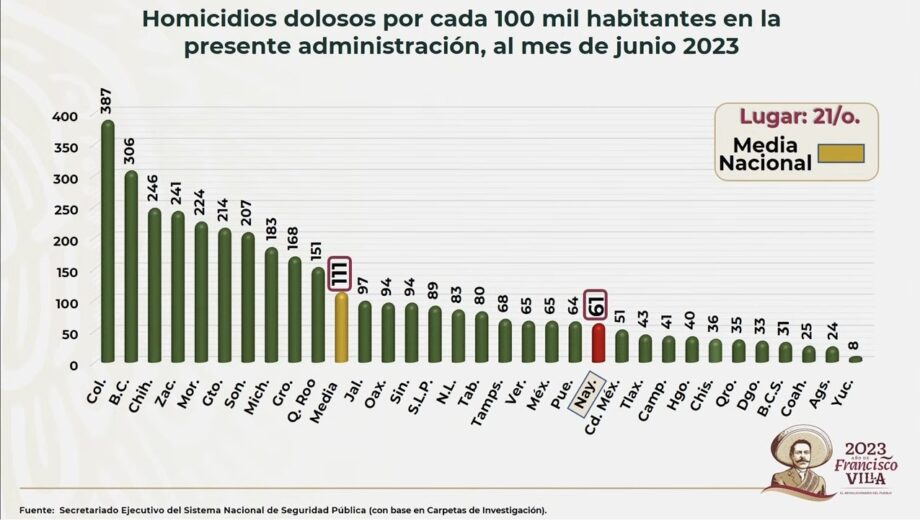 La entidad es la octava con la menor tasa de crímenes, al promediar 40 asesinatos por cada 100 mil habitantes durante el actual sexenio, de acuerdo con el informe que se presentó este viernes durante la conferencia de prensa presidencial, desde Nayarit.