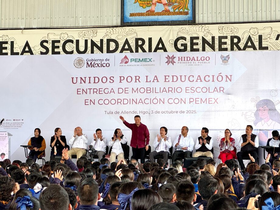 El presidente municipal de Tula de Allende, Cristhian Martínez, acompañó al gobernador del estado, Julio Menchaca Salazar, en el evento “Unidos por la Educación: Entrega de Mobiliario Escolar en Coordinación con Pemex”, con el objetivo de fortalecer las condiciones educativas de escuelas en Tula y la región.