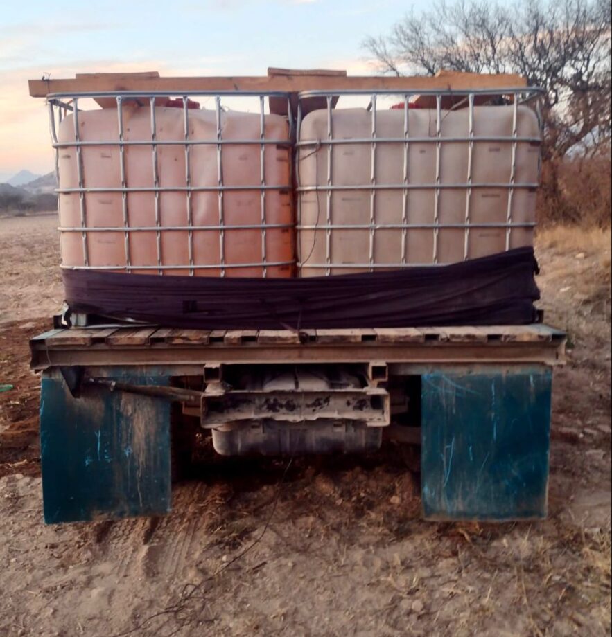 Al inspeccionar la unidad, se localizaron ocho contenedores con capacidad de mil litros abastecidos al 100 por cierto con hidrocarburo, así como 150 metros de manguera de alta presión con señales de haber sido utilizados para el trasiego de combustible.