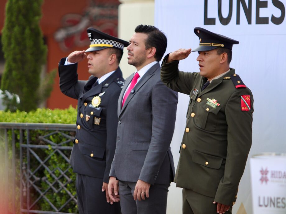 Este lunes, la Plaza Juárez de Pachuca fue escenario del acto cívico encabezado por Miguel Ángel Tello Vargas, titular de la Unidad de Planeación y Prospectiva del Gobierno de Hidalgo, en compañía de estudiantes de la Secundaria Técnica 1 y la Primaria Vicente Guerrero, además de las fuerzas federales.