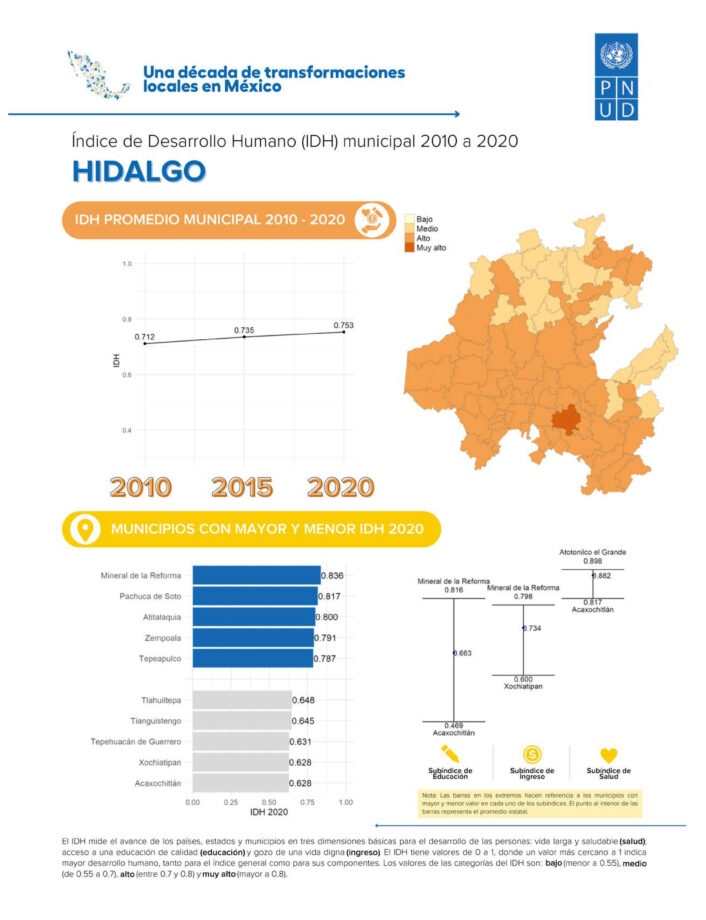 Hidalgo lidera los avances municipales de desarrollo humano en la década de 2010 a 2020, al presentar las tasas de crecimiento acumulado más elevadas en relación con el resto de los estados del país, de acuerdo con un estudio del Programa de las Naciones Unidas para el Desarrollo (PNUD) en México.