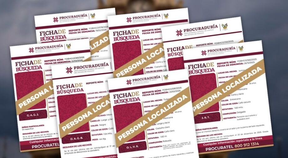 Durante la reunión semanal del Gabinete de Seguridad, el gobernador de Hidalgo, Julio Menchaca Salazar, informó que en los últimos días fueron localizadas 11 personas que contaban con ficha de búsqueda: seis adultas y cinco menores de edad; con lo cual, dijo, se reafirma el compromiso de la administración estatal para fortalecer la búsqueda de personas desaparecidas.