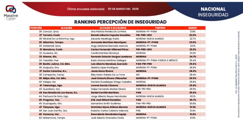 De acuerdo con la más reciente medición nacional realizada por la casa encuestadora Massive Caller, correspondiente a marzo de 2026, el municipio registró una percepción de inseguridad de 22.7 por ciento, la más baja entre todos los municipios evaluados en Hidalgo.