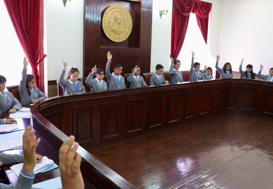 Durante la actividad, estudiantes de la Escuela Primaria Plutarco Elías Calles tomaron el rol del funcionariado municipal y desarrollaron una sesión ordinaria del Ayuntamiento, en la que presentaron y votaron por mayoría un punto de acuerdo a favor del medio ambiente.