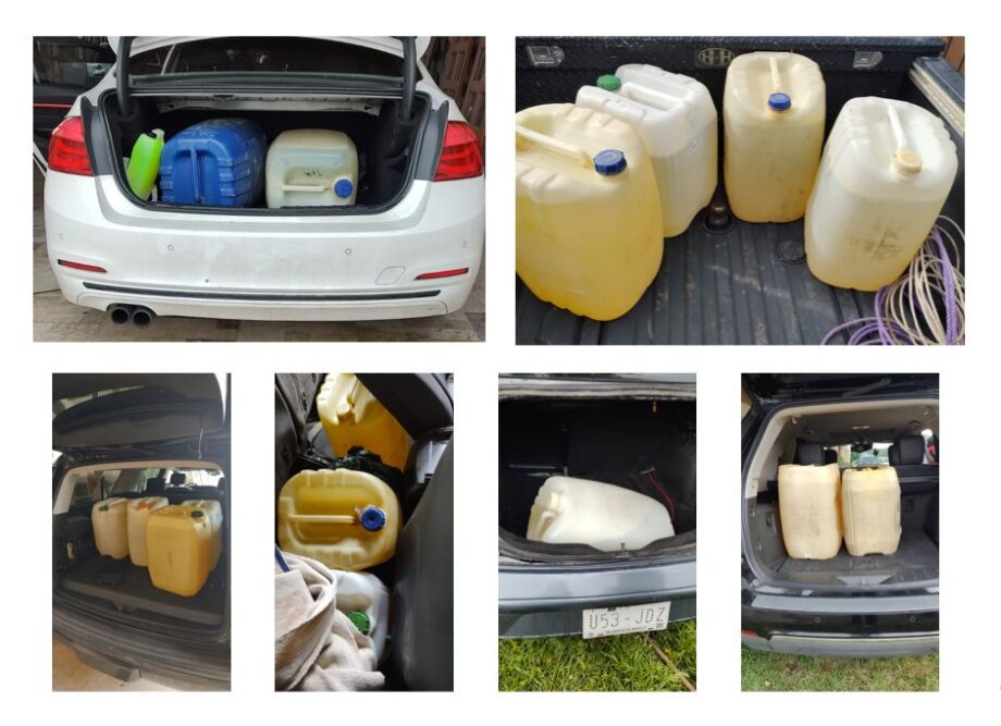 En dicho predio, se confiscaron ocho camionetas de diferentes marcas, dos motocicletas Italika, un vehículo todoterreno razer, dos automóviles Volkswagen, una cuatrimoto y un camión Dodge de redilas, además de nueve bidones con capacidad de 50 litros, abastecidos al 100 por ciento con combustible y un contenedor de mil litros abastecido al 10 por ciento con hidrocarburo.