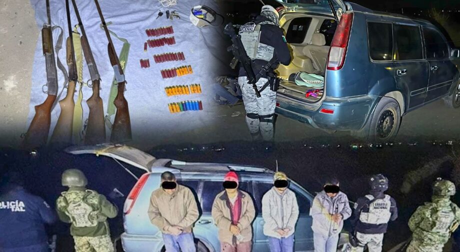 Durante estas acciones se logró la detención de cuatro personas, además del aseguramiento de cuatro armas de fuego largas, 64 cartuchos y un vehículo.