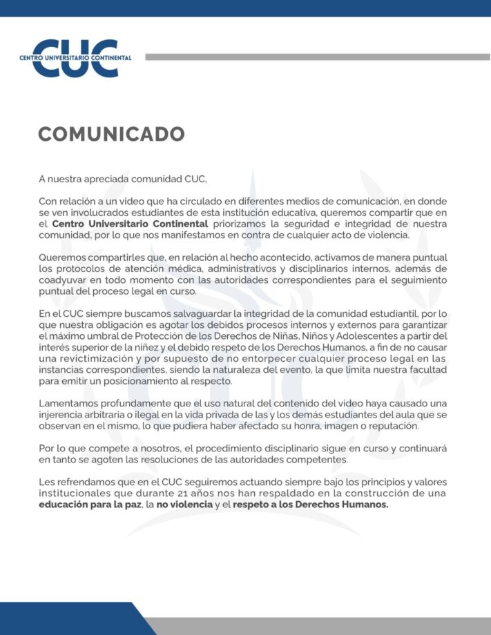 En un video de una cámara de seguridad, que se viralizó en redes sociales y con fecha 29 de agosto, se ve cómo un alumno del CUC rodea el cuello de su compañera y lo aprieta, lo que provocó que la estudiante se desmayara.
