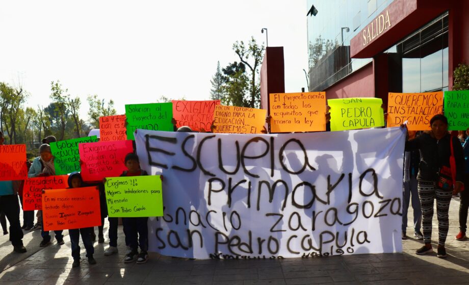 Padres de familia de la escuela primaria Ignacio Zaragoza, ubicada en San Pedro Capula, municipio de Ixmiquilpan, se manifestaron frente a las instalaciones del Palacio de Gobierno, en Pachuca, para exigir la construcción de un arcotecho, una solicitud que llevan haciendo desde hace tres años.