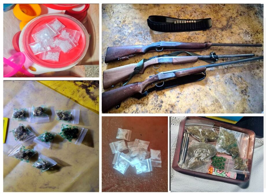 Además, en los domicilios ubicados en las localidades de San Juan Hueyapan, Cima de Togo y El Aserradero, se confiscó un total de 147 dosis de presunta marihuana, 136 dosis de la droga sintética “cristal”, cinco camionetas de diversas marcas, cuatro armas de fuego largas tipo escopeta y nueve cartuchos útiles.