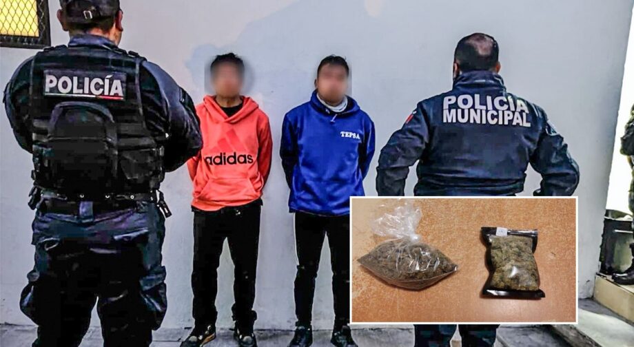 Dos jóvenes de 25 y 19 años fueron detenidos en el fraccionamiento Rinconada de Los Ángeles, donde agentes municipales les aseguraron 7 dosis de cristal, 4 bolsas de marihuana, dinero en efectivo y dos armas blancas.