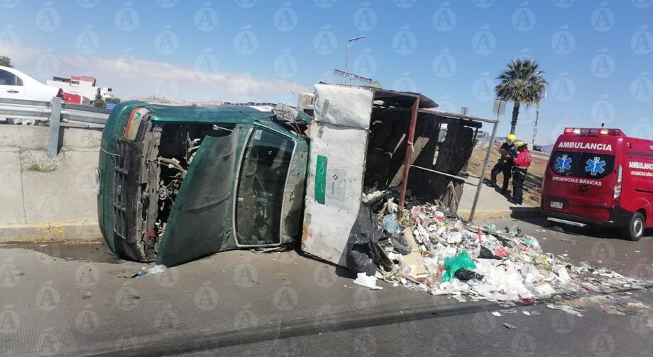 Servicios de emergencias atendieron la volcadura de un camión de basura en el Puente Colonias, en inmediaciones del fraccionamiento Villas de Pachuca, al sur de la capital hidalguense. Los residuos sólidos quedaron esparcidos en el pavimento, luego de que el camión terminara recostado en su lado izquierdo.