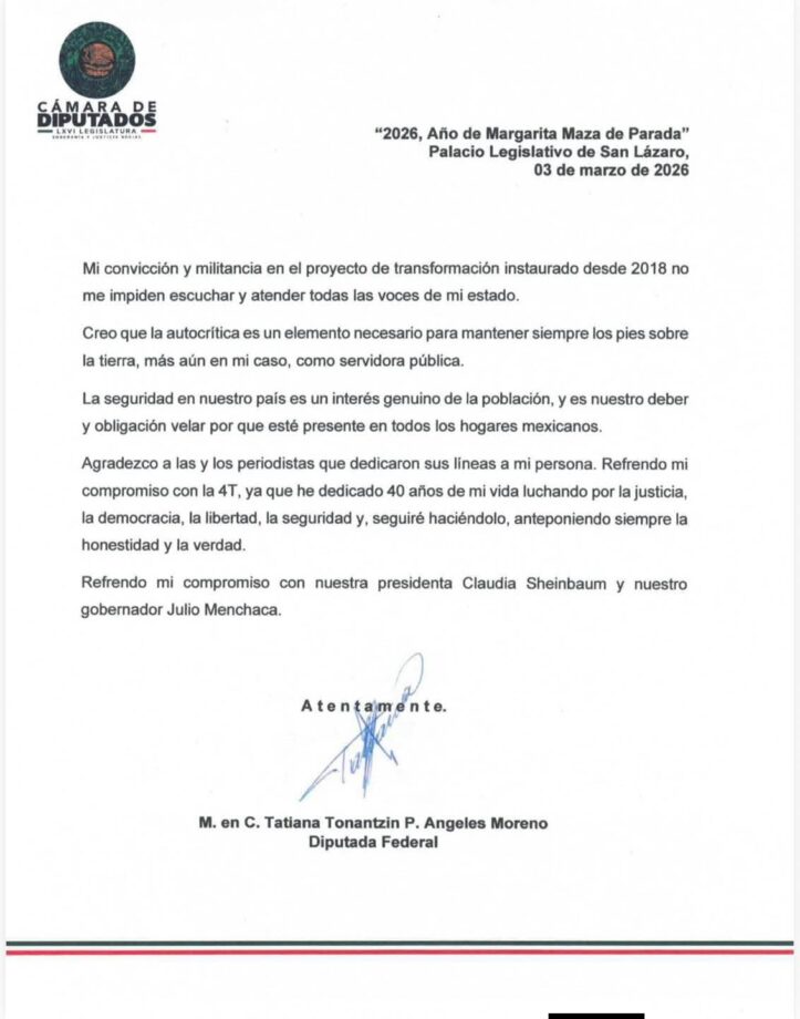 Desde el Palacio Legislativo de San Lázaro, la diputada federal Tatiana Ángeles Moreno emitió un posicionamiento en el que afirmó que su convicción dentro del proyecto de transformación iniciado en 2018 no está reñida con la apertura al diálogo ni con la autocrítica.