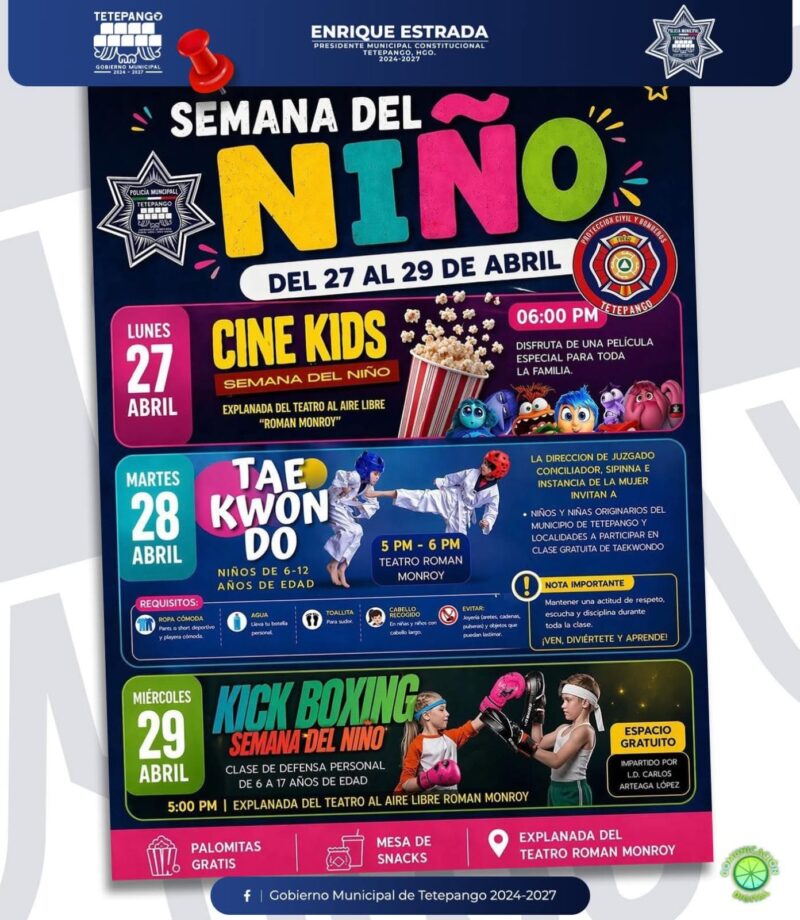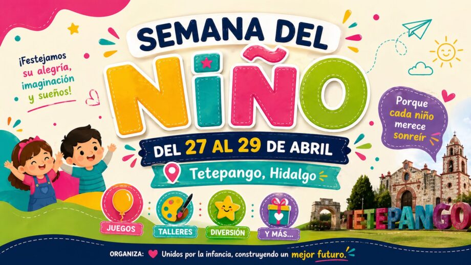 El Gobierno Municipal de Tetepango, encabezado por el alcalde Enrique Adrián Estrada Corres, anunció la realización de la Semana del Niño, una jornada especial de actividades gratuitas dirigida a niñas, niños y sus familias, que se llevará a cabo del 27 al 29 de abril.