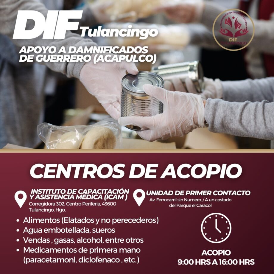 Con un horario de 9:00 a 16:00 horas, el Sistema DIF Tulancingo habilitó y puso en marcha dos centros de acopio oficiales donde se recabarán víveres para canalizar ayuda a las familias damnificadas por el huracán John en el estado de Guerrero.