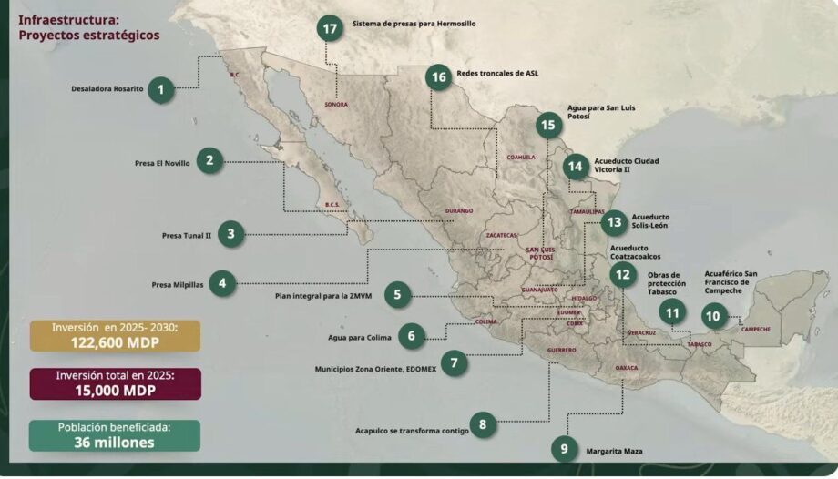 El paquete nacional incluye obras en Sonora, Nuevo León, Baja California, Quintana Roo, Yucatán, Sinaloa y Chiapas, además de proyectos de saneamiento, plantas potabilizadoras y tecnificación de riego agrícola. En total, se estima una inversión de más de 122 mil 600 millones de pesos para garantizar la seguridad hídrica a mediano y largo plazo.
