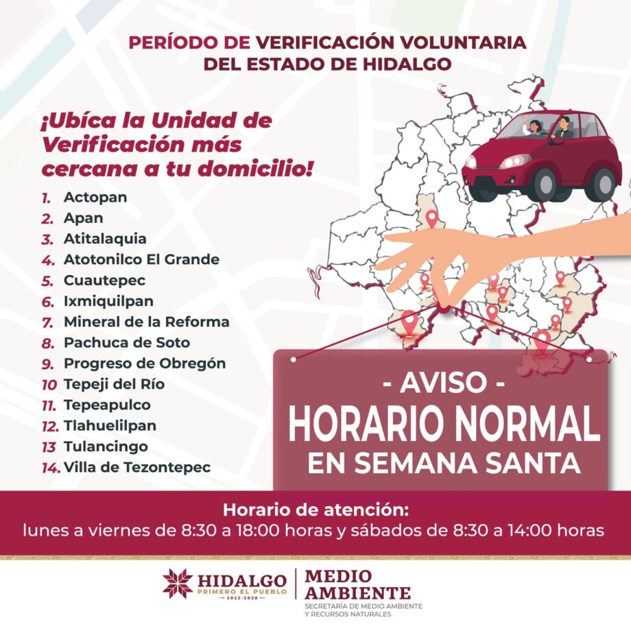 Lo anterior fue informado por la Secretaría de Medio Ambiente y Recursos Naturales de Hidalgo, que continúa con el programa de verificación vehicular voluntaria hasta el 30 de junio de 2023.
